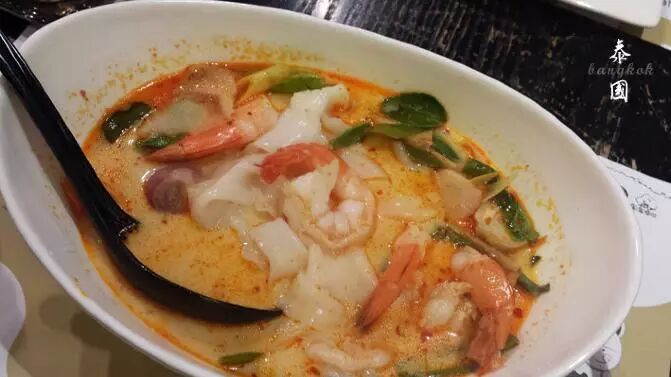 暹羅中心1F美食廣場,一碗冬陰功,蝦超Q,幾乎是彈牙的感覺,60RMB一碗,外加17%稅費;