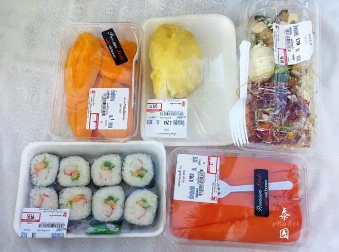 木瓜、番石榴、蓮霧、芒果、山竹、榴槤、香蕉。街道邊都是推車賣水果的,一個透明的食品袋裝上切好洗凈的水果,一般50-100株不等。