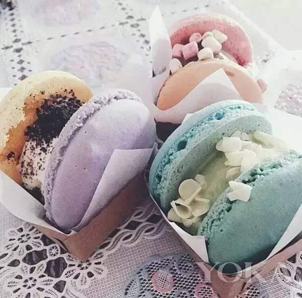 首先閃亮登場的甜品就是已經風靡歐美市場的冰淇淋馬卡龍了!馬卡龍一直占據著甜品界重要的位置,大家是有目共睹的。但馬卡龍的口感實在不適合吃太多,所以一枚有才的吃貨想到了在馬卡龍中間加上冰淇淋的吃法,不僅解膩,更重要的是,讓本來就美美噠的糖果色馬卡龍變得更加討人喜歡了。